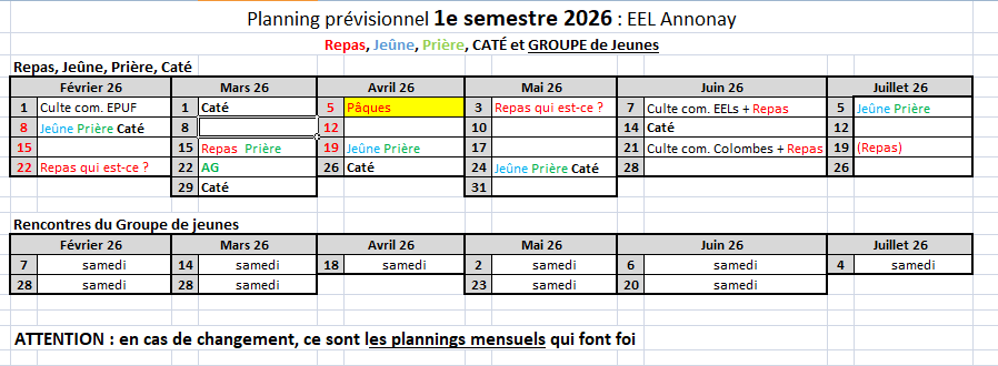 - Le dimanche 11 janvier : Journée communautaire. Temps de prière à 9h15 au forum, Culte, suivi d’un repas partagé et d’un temps de prières d’intercession pour la communauté à 14h30.